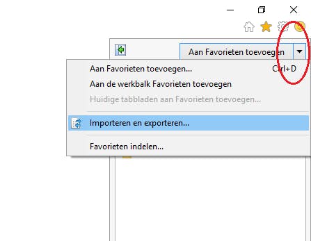 Klik in dit veld op het pijltje naast de optie 'Aan Favorieten toevoegen'. Er komt een menu naar beneden. Klik daar op 'Importeren en exporteren'.