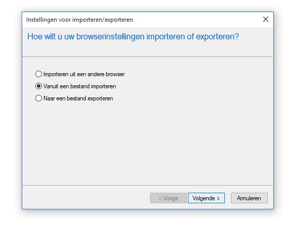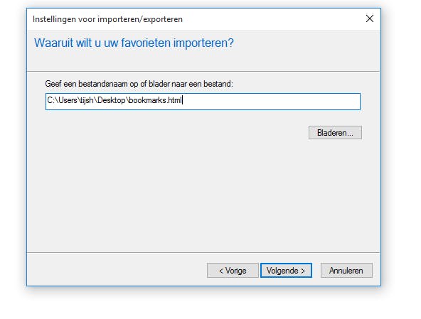 Je moet nu aangeven waar je je Favorieten vandaan wilt halen. Klik daarvoor op 'Bladeren' en navigeer naar de plek waar je het export-bestand bij stap 1 hebt neergezet. Klik vervolgens weer op 'Volgende'.