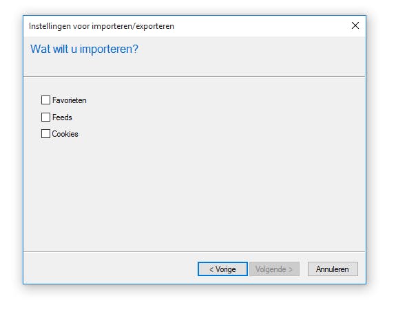 Je kunt nu aangeven wat je allemaal wil importeren. Naast Bladwijzers kunnen dat ook cookies zijn (waarmee sommige websites je wachtwoord bijvoorbeeld onthouden) en je Feeds. Klik op 'Volgende'.