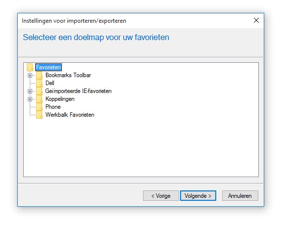 IE vraagt je in welke map je je Favorieten wil opslaan. Wij kiezen voor het gemak gewoon de bovenste: 'Favorieten'. Let op: Als je ervoor hebt gekozen om ook je feeds en je cookies te importeren, krijg je dit veld nog 2 keer te zien. Je moet dan van ieder bestand aangeven waar je het wil hebben.