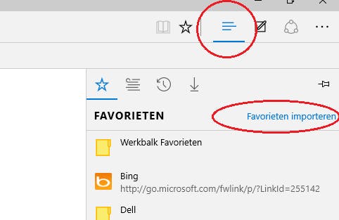 Goed, we zijn er bijna. Je kunt je Favorieten nu makkelijk importeren in Edge, de nieuwe browser in Windows 10. Start de browser, en ga via het hamburgermenu bovenin naar je Favorieten. Je ziet daar rechtsboven in blauwe letters 'Favorieten importeren' staan.