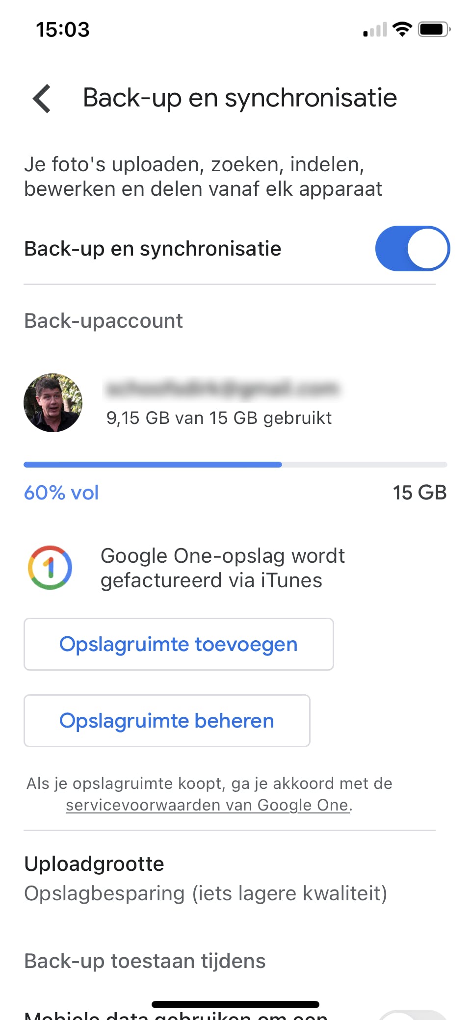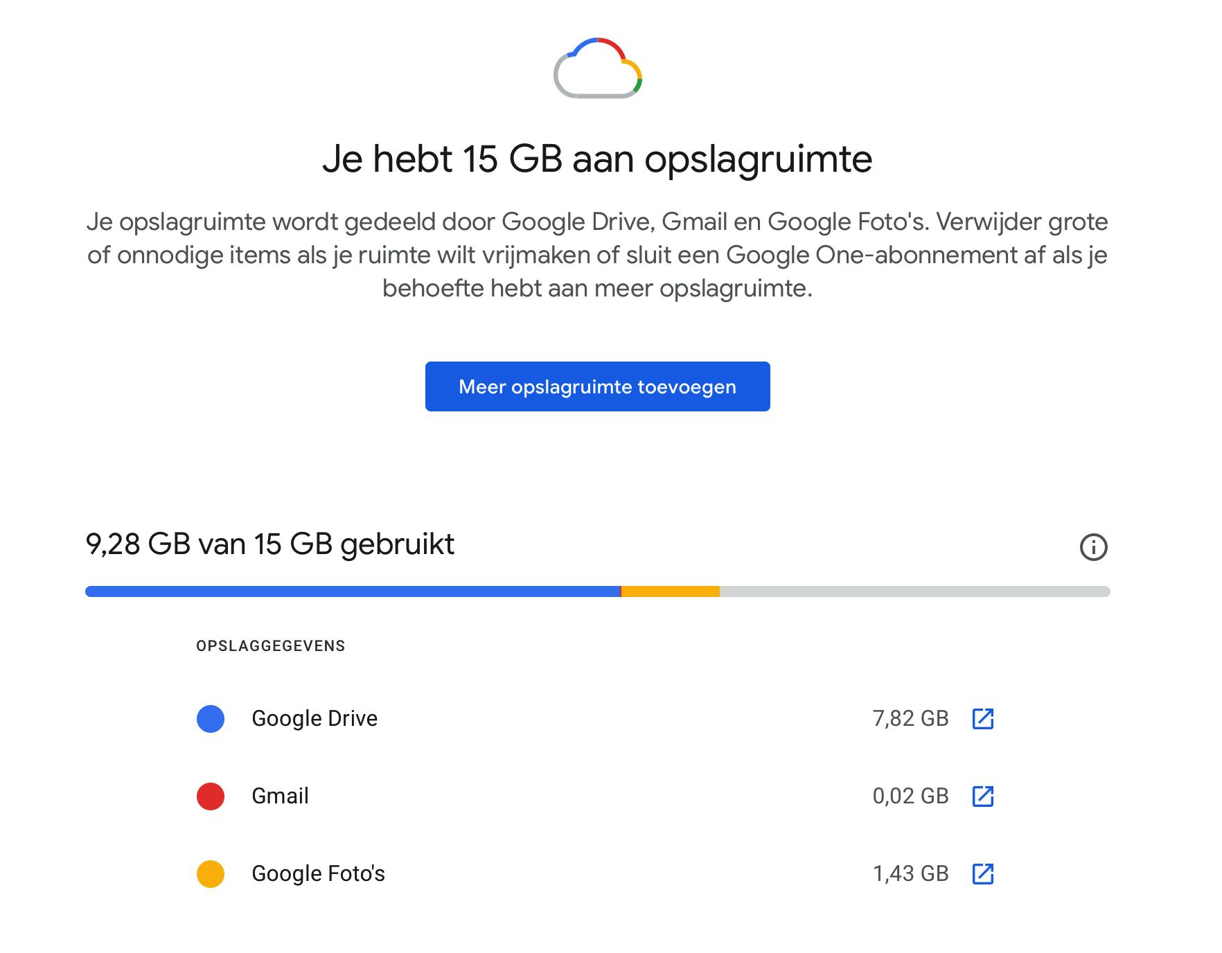 Google heeft een webpagina waar je kunt volgen hoeveel ruimte er overblijft: https://one.google.com/storage. Tegelijk lees je bij de opslaggegevens hoeveel er door Google Drive, Gmail en Google Foto’s wordt ingenomen. Is er nog voldoende ruimte beschikbaar, dan is er geen vuiltje aan de lucht. Wordt het te krap, dan moet je grote schoonmaak houden.