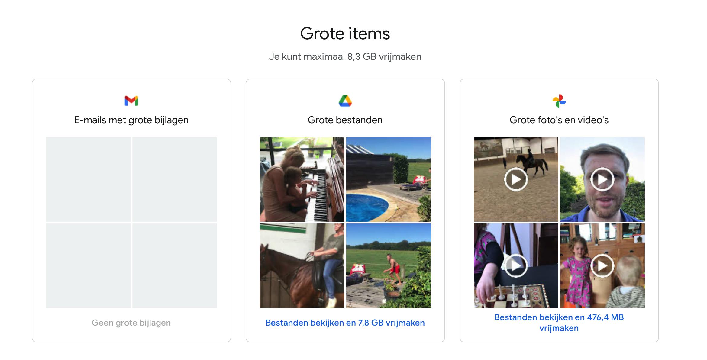 Daaronder stelt Google voor om bepaalde inhoud te checken en eventueel te verwijderen. De software zoekt bijvoorbeeld zelf naar de onscherpe foto’s. Ook de screenshots en afbeeldingen die afkomstig zijn van andere apps mogen misschien weg? Daar weer onder volgen de foto’s en video’s die opvallend groot zijn. Dankzij de functie Checken en verwijderen win je in een kwartiertje heel veel ruimte.