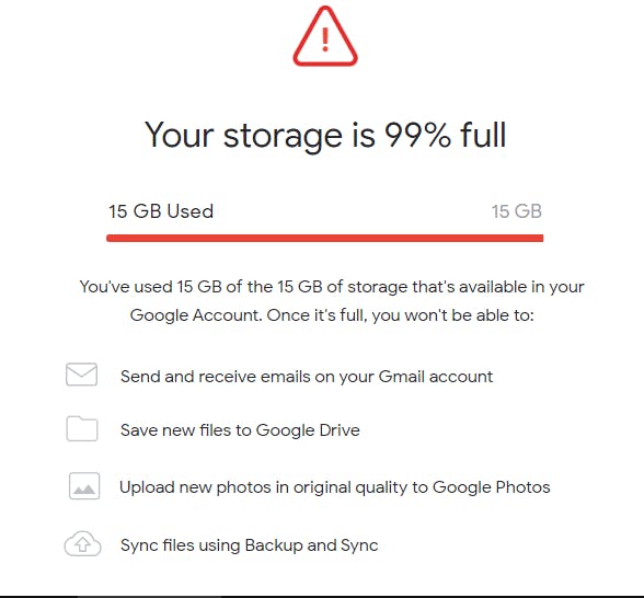 Als je geen ruimte meer hebt, kun je geen back-up meer maken van de bestanden in je account. Concreet betekent dit dat je geen foto’s en bestanden meer handmatig kunt uploaden naar Google Foto’s en Google Drive. Je kunt je nog steeds aanmelden, maar het is zelfs mogelijk dat je problemen krijgt om in Gmail berichten te verzenden.