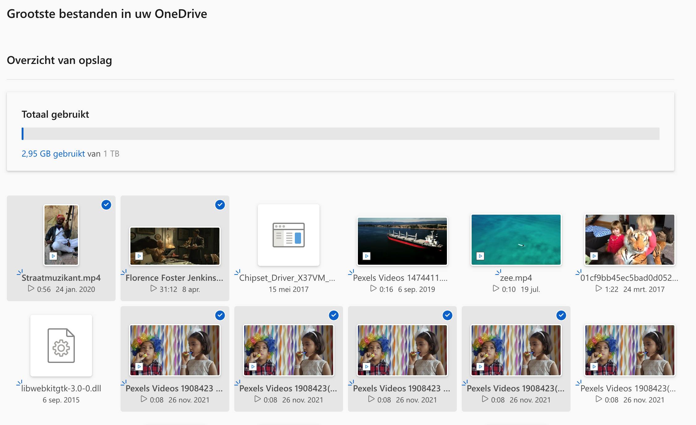 Onderaan het balkje lees je in het blauw Wat neemt ruimte in beslag? Dat is de link die je rechtstreeks naar een pagina brengt die de grote bestanden toont. Beweeg met de muisaanwijzer over zo’n miniatuur zodat er een cirkeltje verschijnt om het bestand te selecteren. Op die manier vink je alle bestanden aan die weg mogen en klik je op de knop Verwijderen. Deze bestanden verdwijnen zowel uit het OneDrive-cloud-account als uit de OneDrive-map op je computer.