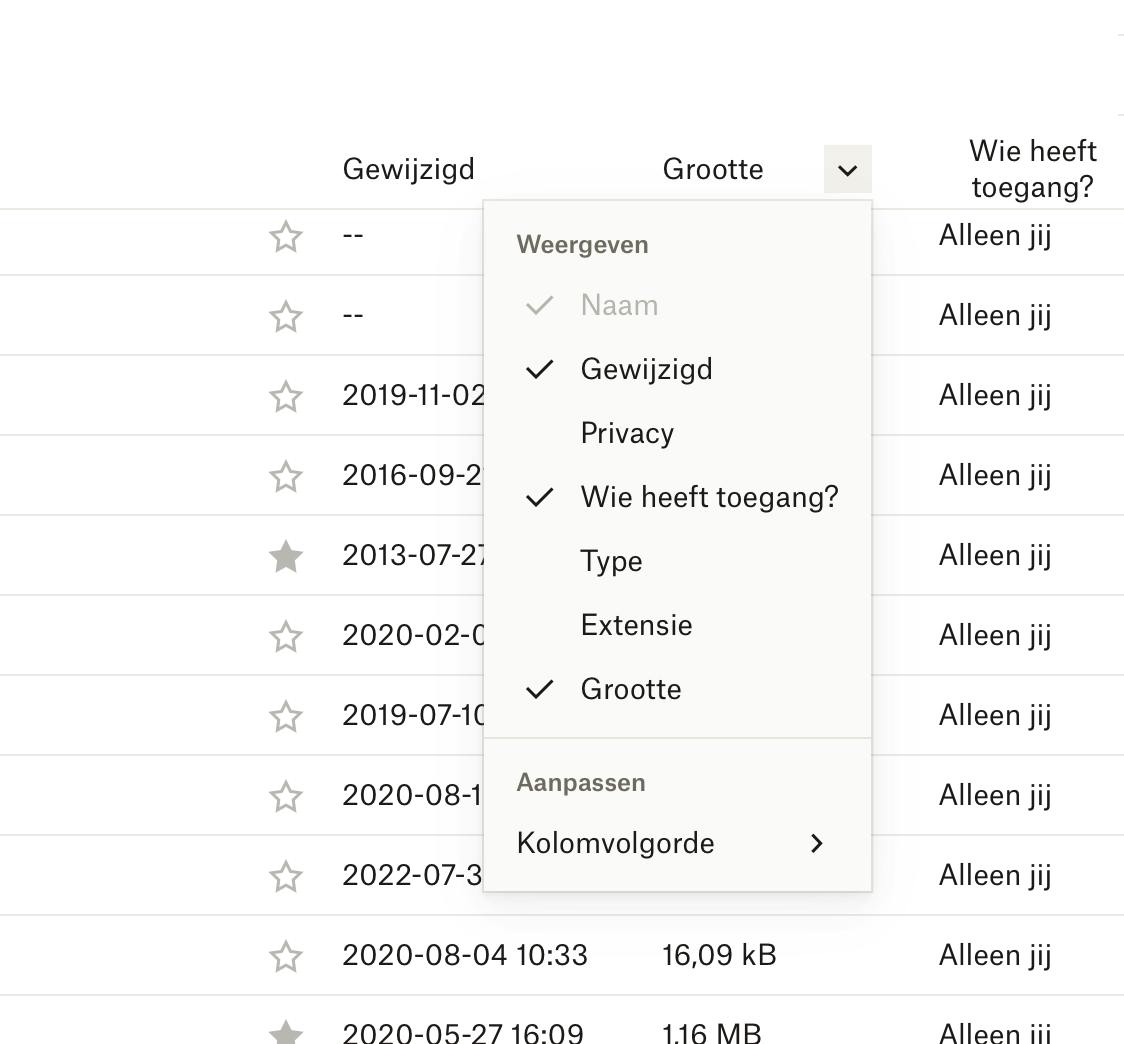 Wil je ook deze cloudopslag trimmen, begin dan op de Dropbox-website. Klik op een kolomkop en kies Grootte (vaak staat de optie Grootte er nog niet en moet je die nog uit het uitklapmenu halen). Op die manier kom je snel bij de grootste bestanden, waar de meeste ruimtewinst te halen valt. Bij mappen worden de volumes niet automatisch weergegeven. Je krijgt een schatting als je op de drie stippen naast een map klikt en de functie Grootte berekenen selecteert.