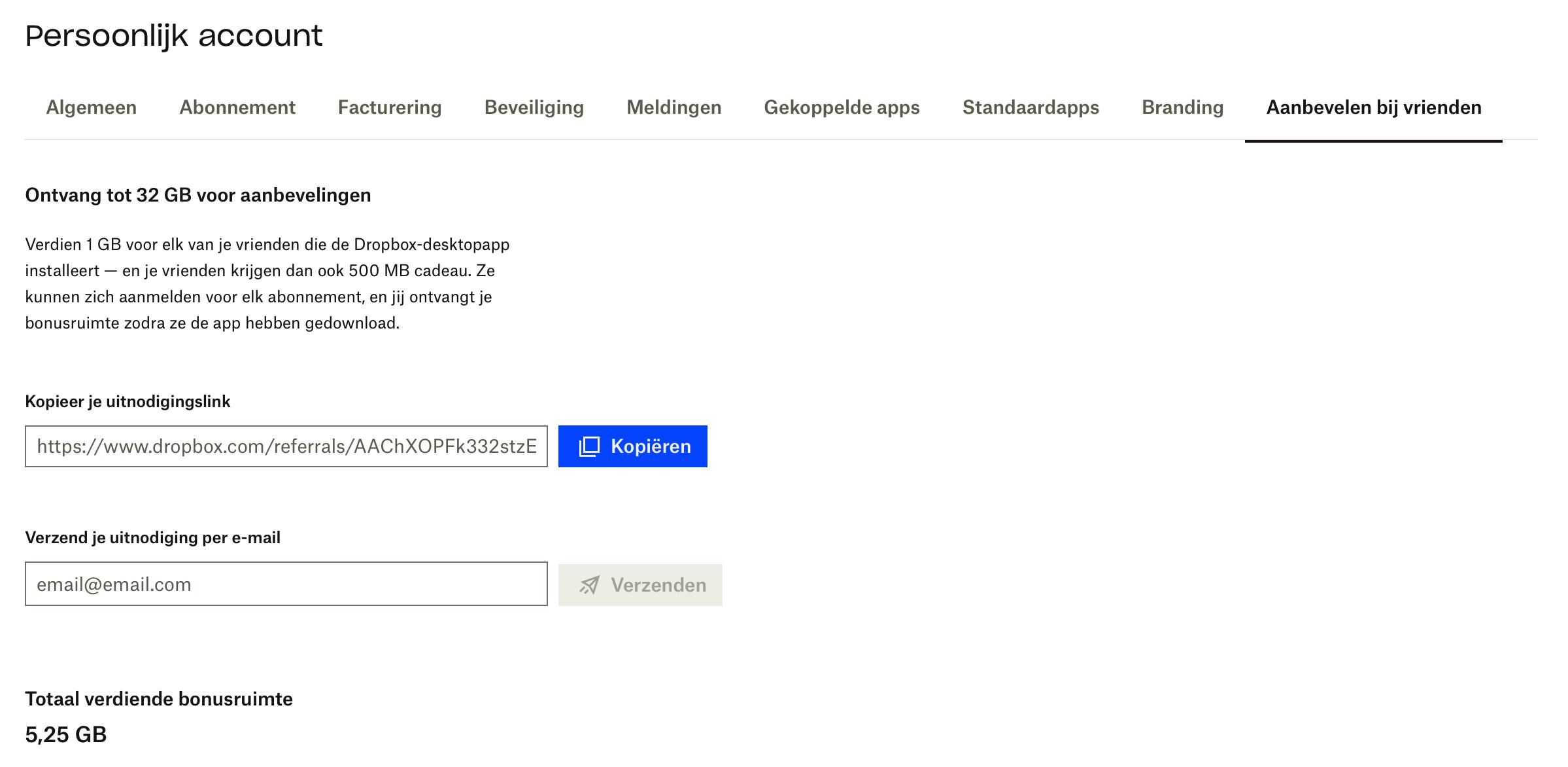 Via Instellingen / Persoonlijk account kom je bij het tabblad Aanbevelen bij vrienden. En daar vind je de uitnodigingslink die je kunt kopiëren en versturen naar je vrienden. Door feedback te geven op Tell us why you love Dropbox, ontvang je ook nog eens 125 MB.