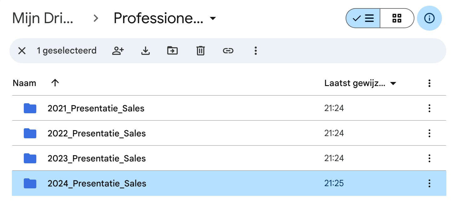 Naamgevingsconventie is hoe je je bestanden een naam geeft. Het is een ouderwetse tip, maar hij blijft geldig. Wees consequent en duidelijk in de naamgeving van documenten. Houd de namen kort, simpel en betekenisvol. Dit is zelfs nog belangrijker voor bestanden die je deelt met anderen. Heb je bijvoorbeeld verschillende mappen die bedoeld zijn voor andere teams, dan kun je de naam van het team tussen haakjes zetten. Op die manier ziet iedereen meteen voor wie de inhoud is bedoeld. Gebruik afkortingen die gemakkelijk te onthouden zijn. Je kunt ook datums, tags of nummers gebruiken om bestanden en mappen in de juiste volgorde te zetten in plaats van de vaak gebruikte alfabetische indeling.
