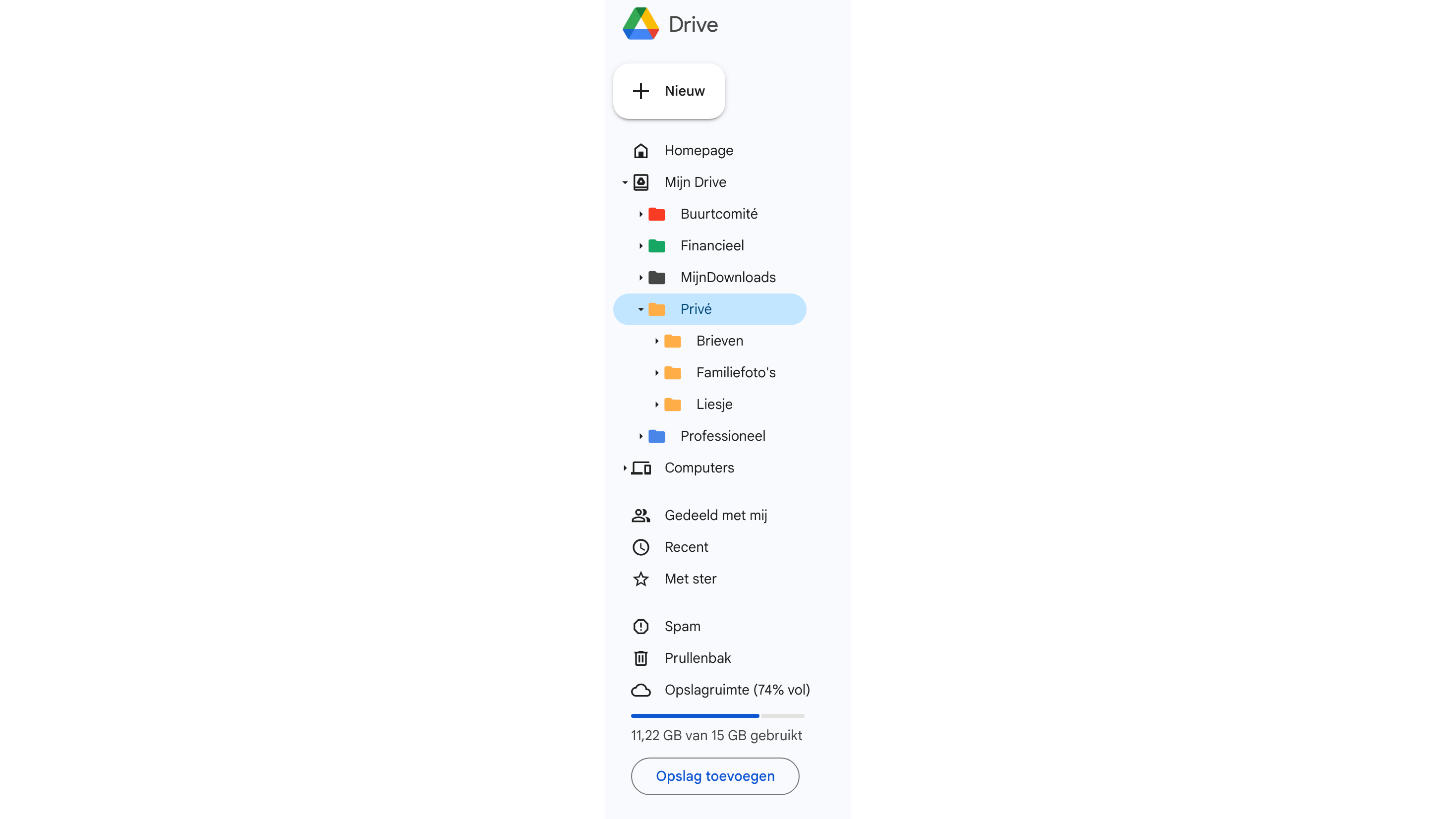 Google Drive maakt zelf vier categorieën aan: Mijn Drive, Gedeeld met mij, Recent en Met ster. In de categorie Mijn Drive kun je creatief zijn. Hierin zet je een structuur op zoals je de harde schijf van je computer organiseert. Begin met het maken van een toplevel en splits op in categorieën, zoals Professioneel, Buurtcomité en Familie. Je werkmap kan dan weer submappen bevatten, zoals Documenten, Rapporten en Presentaties. Bij Recent zie je alle actuele documenten staan die je hebt geopend; ze staan op datum en tijd. Deze categorie is dus erg handig als je snel verder wilt werken aan een document waar je gisteren nog mee bezig bent geweest.