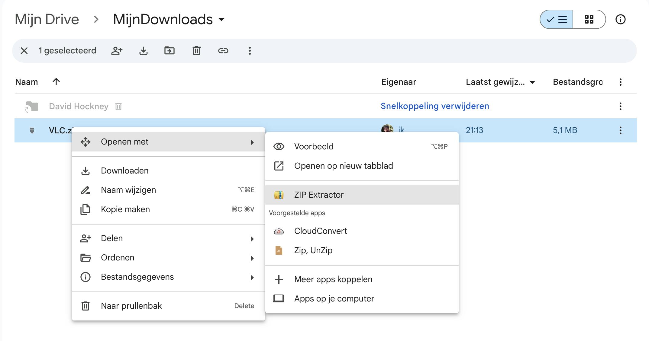 Met de rechtermuisknop kun je ZIP Extractor aanspreken in Google Drive.