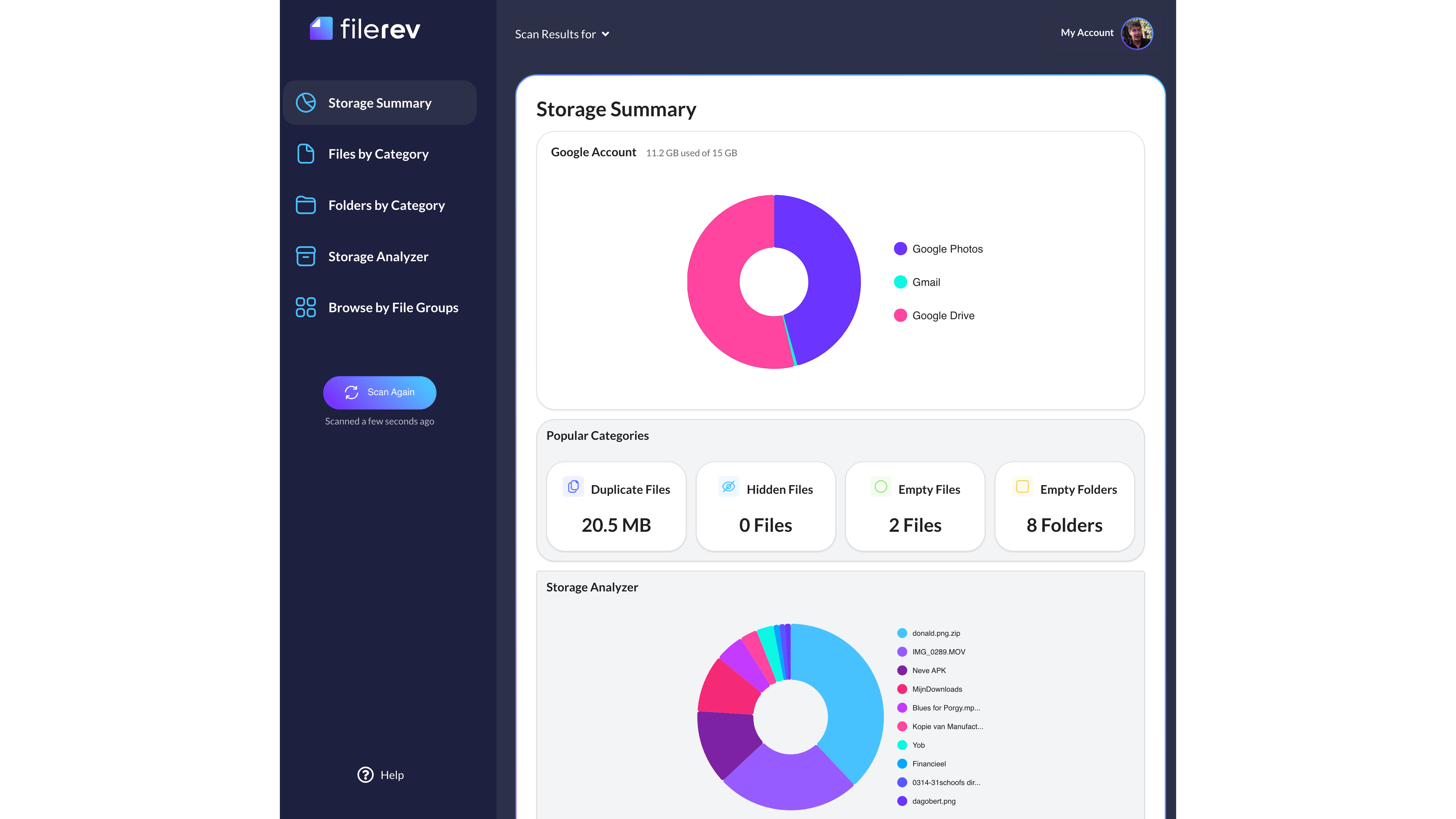 Met één scan van Filerev krijg je een overzicht van alle documenten en afbeeldingen die in de mappen van Google Drive zitten. Dit is ook een prima tool om de dubbele bestanden te detecteren en te verwijderen die zich in de loop van de tijd hebben opgestapeld. Je krijgt bovendien een duidelijk beeld van hoe de opslag wordt verdeeld tussen Google Drive, Gmail en Google Foto’s en je ziet welke mappen en welke bestandsindelingen de grote ruimteslokoppen zijn.