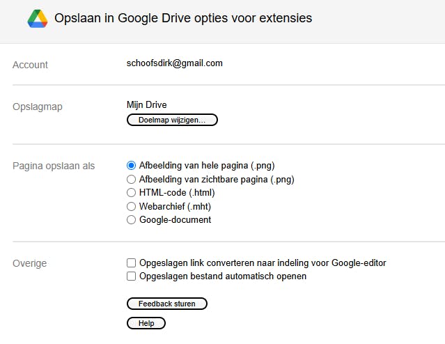 In de voorkeuren van Save to Google Drive leg je eerst een doelmap vast.
