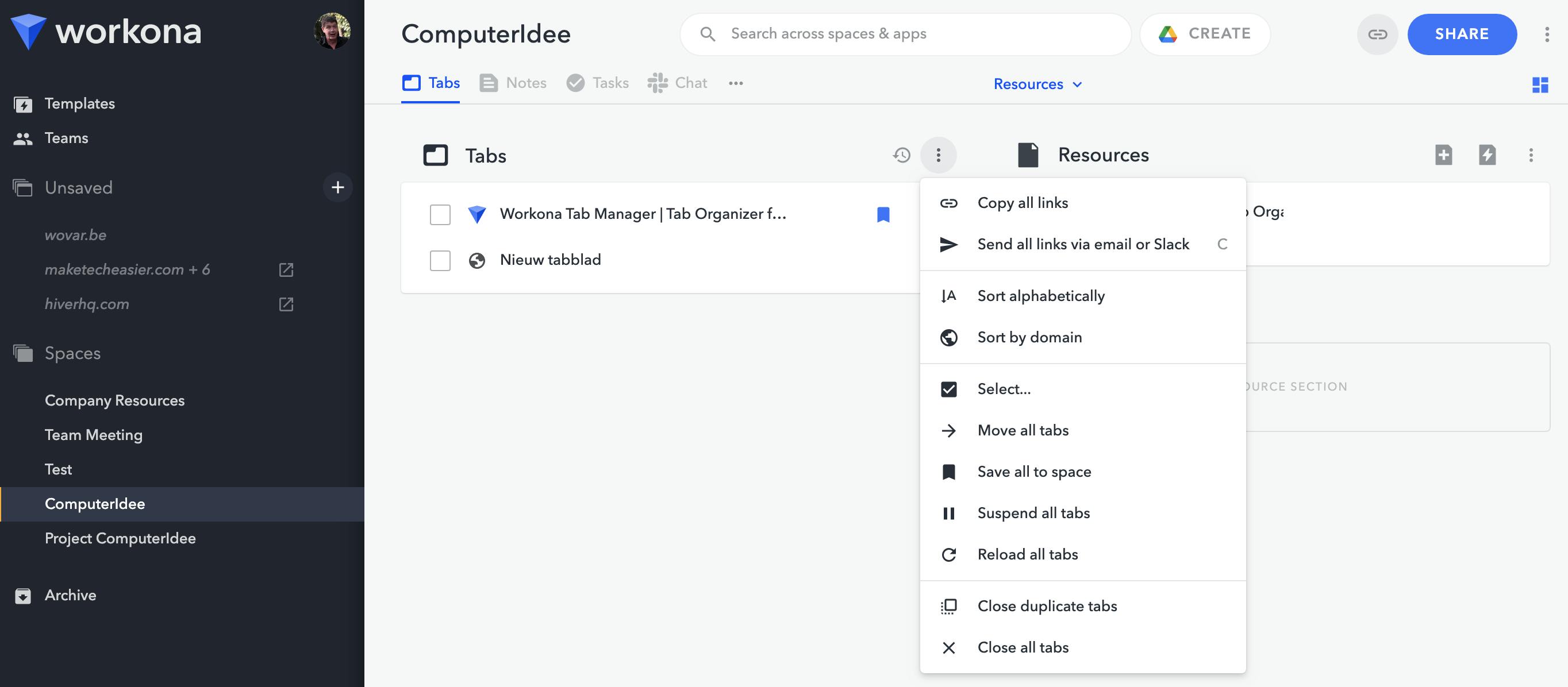 Met Workona voeg je ook verschillende subtabbladen toe en creëer je één werkomgeving waar alle afbeeldingen, spreadsheets, documenten en presentaties samenkomen. Per project maak je dan een nieuwe werkruimte. Elke tab kun je synchroniseren tussen verschillende apparaten en er is een zoekfunctie die tegelijk in verschillende werkruimten en tabs zoekt. Workona is niet gratis, met een betaald abonnement van 7 dollar per maand kun je onbeperkte werkruimte gebruiken.