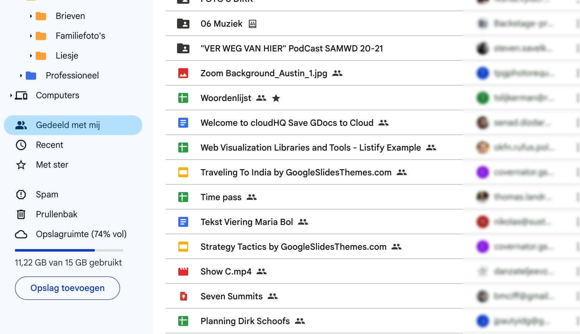 In de linkerkolom vind je ook de categorie Gedeeld met mij. Hier zitten alle bestanden en alle mappen die anderen met jou hebben gedeeld en alle bestanden die je via een deellink van anderen hebt ontvangen. Alles wat je hier ziet, telt niet mee in de berekening van je persoonlijke opslag. Je wint dus geen Google-opslagruimte door hier grote schoonmaak te houden. De bestanden blijven eigendom van degene die ze oorspronkelijk heeft geüpload en tellen mee in diens quotum.