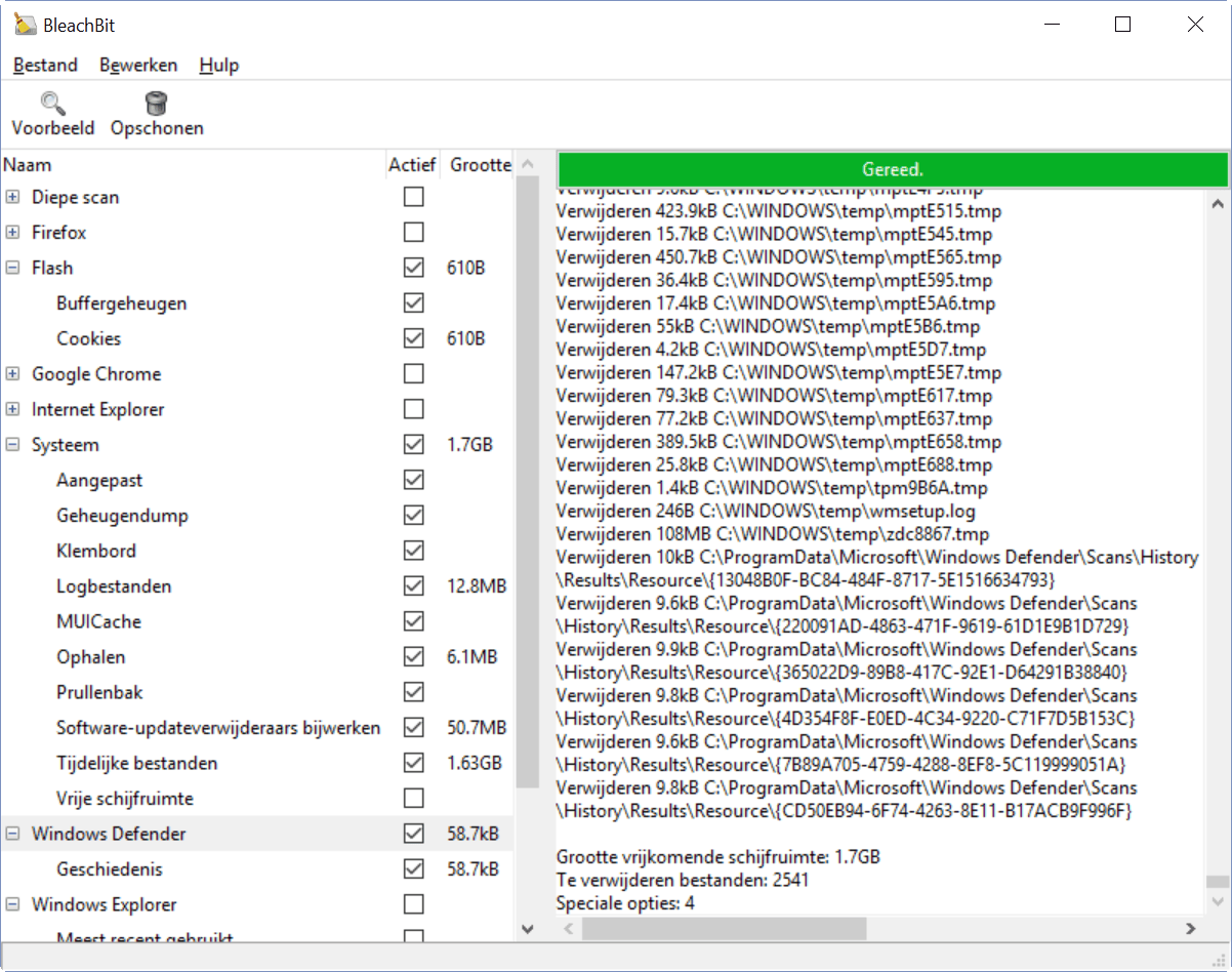 Als je eenmaal de lijst hebt doorgewerkt van wat je zoal wilt verwijderen, kun je bovenaan het proces starten door op Opschonen te klikken. Het is ook mogelijk om te kiezen voor Voorbeeld. Dan krijg je te zien welke bestanden BleachBit allemaal zou verwijderen als je op Opschonen had geklikt. Zo kun je eerst nog controleren of er niet iets in de bestanden zit dat je toch nog wilt behouden, voordat het definitief weg is. Onderaan de lijst staat hoeveel schijfruimte je met deze wijzigingen vrijmaakt.