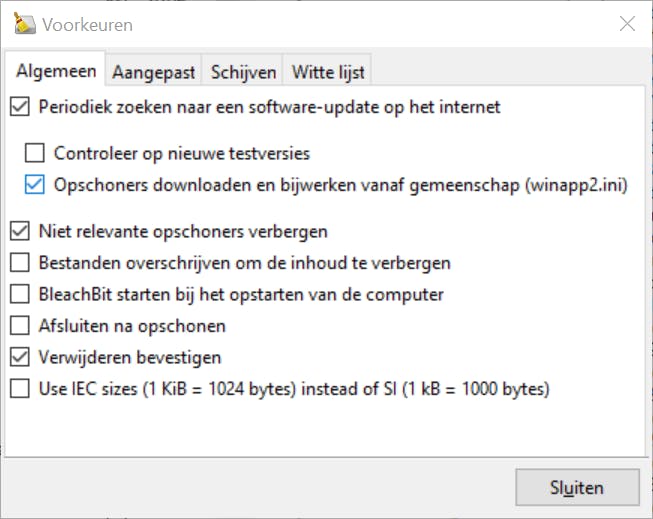 Het is overigens mogelijk BleachBit nog meer programma’s te laten legen, namelijk zo’n 2500, door gegevens vanuit de community. Deze lijst met zogenaamde cleaners kun je inschakelen door op Bewerken te klikken en te kiezen voor Voorkeuren. Vink hier op het eerste tabblad de derde optie aan: Opschoners downloaden en bijwerken vanaf gemeenschap (winapp2.ini). Klik op Sluiten en sluit BleachBit daarna helemaal af en open het opnieuw om de wijzigingen actief te maken. Na het openen laadt het programma heel even de nieuwe lijst in en zie je dat er links veel meer programma’s bij zijn gekomen. Onder bijvoorbeeld Programma’s staat geïnstalleerde software, waarvan van veel programma’s de tijdelijke bestanden verwijderd kunnen worden die anders blijven staan.