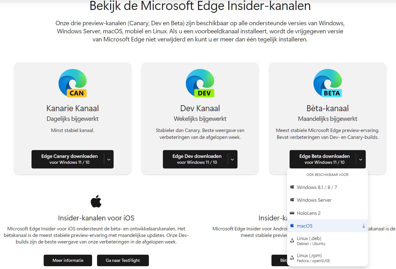 Voor Edge bezoek je www.microsoftedgeinsider.com, waar je kunt kiezen tussen het Bèta-, Dev- en Kanarie-Kanaal. Deze bieden respectievelijk maandelijks, wekelijks en dagelijks updates en zijn beschikbaar voor Windows, macOS en Linux. Voor Android download je de app Microsoft Edge Beta in de officiële Play Store. Voor de Apple App Store ligt dit helaas ingewikkelder. Je moet je daarvoor eerst aanmelden via het TestFlight-programma (zie paragraaf ‘Mobiele apps’).
