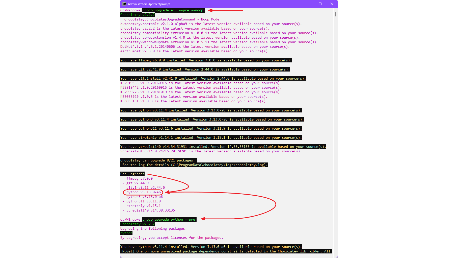 Voeg --pre toe achteraan het commando om ook naar eventuele bèta-updates op zoek te gaan in de database van Chocolatey, en --noop (no-operation) om alleen een simulatie te doen zonder dat er daadwerkelijk al iets wordt geüpgraded, als volgt: