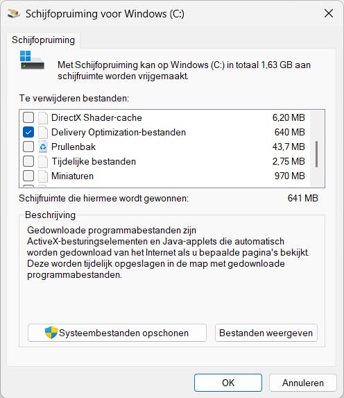 In theorie zijn die bestanden tijdelijk, maar in de praktijk blijven ze soms veel langer staan dan nodig. Heb je recent weinig updates geïnstalleerd, dan blijft de cache beperkt tot enkele megabytes. In andere gevallen kan de cache ongemerkt sterk groeien. Gelukkig kun je deze opslagruimte eenvoudig vrijmaken. Open Schijfopruiming via het zoekmenu, selecteer het systeemstation en klik op OK om een analyse te laten uitvoeren. Zoek in de lijst naar Delivery Optimization-bestanden, vink deze optie aan, klik op OK en bevestig met Bestanden verwijderen.