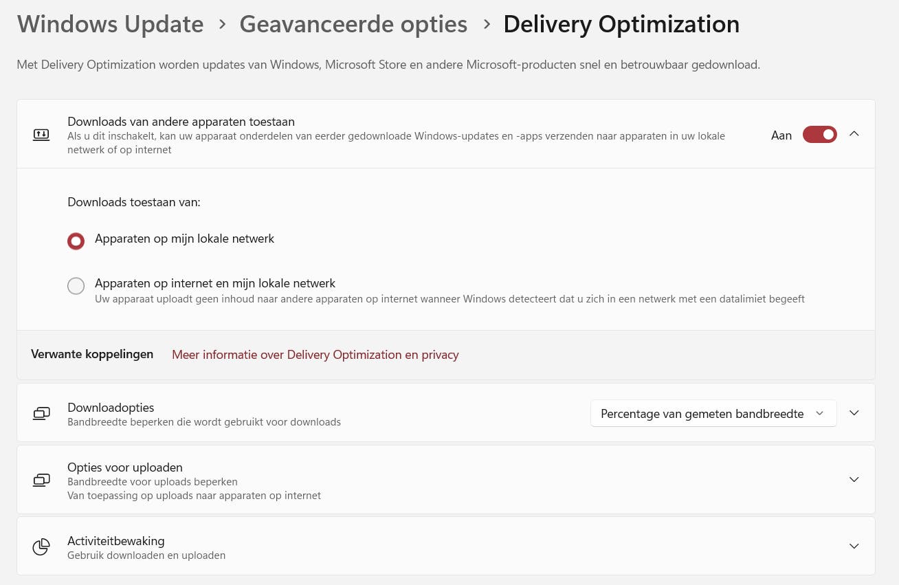 In dit venster bepaal je bovenaan met een schakelaar of je pc onderdelen van Windows-updates en Store-apps mag delen met andere apparaten. Je kunt ervoor kiezen om dit alleen toe te staan binnen het lokale netwerk, of ook met pc’s op het internet. Wie nog verder wil gaan, kan Delivery Optimization nauwkeurig afstellen. Zo stel je in hoeveel procent van de gemeten bandbreedte Windows maximaal mag gebruiken voor downloads en uploads. Op die manier blijft de updatefunctie actief zonder je internetverbinding te domineren. Onderaan vind je bovendien een overzicht met gedetailleerde statistieken over hoeveel data Delivery Optimization heeft gedownload en geüpload.