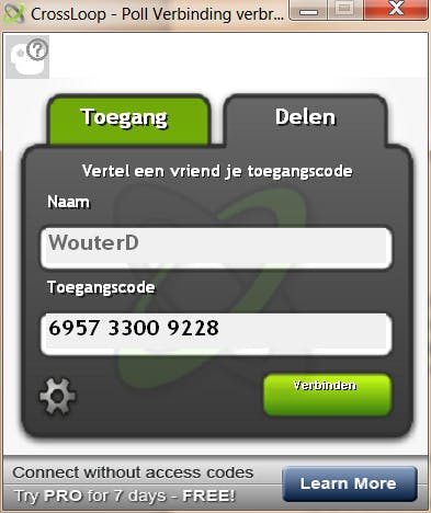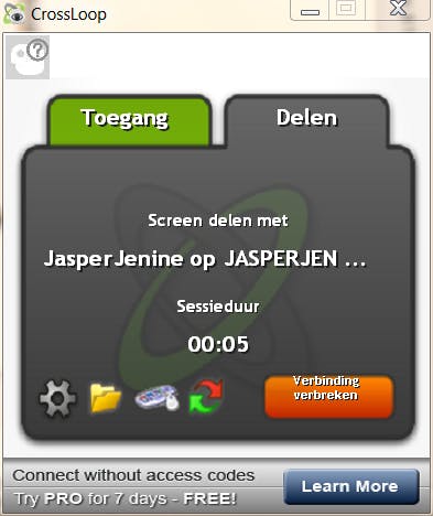 Ook Crossloop is een bekend programma waarmee u hulp op afstand kunt krijgen. U kunt het programma downloaden op de website van CrossLoop. De installatie verloopt snel en simpel. Kies voordat de wizard begint wel voor Nederlands. Zodra u de wizard hebt doorlopen, kunt u meteen aan de slag. Belangrijk is dat de persoon waarmee u verbinding wilt maken ook in het bezit is van Crossloop. Zodra u het programma hebt opgestart, ziet u twee tabbladen. Een tabblad met Toegang en het andere tabblad met Delen. Klik op het tabblad Delen en geef uw computernaam en toegangscode door aan de persoon met wie u uw scherm wilt delen. Aan de andere kant van de lijn klikt de persoon op het tabblad Toegang, waarna hij of zij uw toegangscode invoert en op Verbinden klikt. Hierna kunt u zelf op het andere tabblad ook op Verbinden klikken om verbinding te maken. U krijgt eerst nog een melding dat iemand toegang tot uw pc wil hebben. Klik op Ja om dit te accepteren, waarna uw scherm met uw helper in nood wordt gedeeld.
