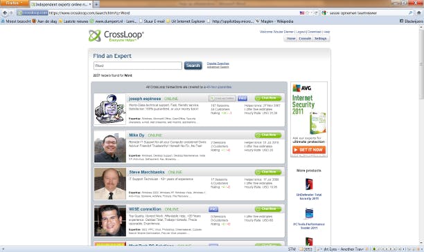 Is uw probleem zo hardnekkig dat u niemand kent die u kan helpen? Crossloop heeft een database met gebruikers die u online op afstand kunnen helpen. Dit kost meestal geld, maar vaak zijn het echte experts die u op weg kunnen helpen en de bedragen die ze vragen, vallen vaak mee. Als u een profiel bij Crossloop hebt, kunt u gebruikmaken van deze diensten. Maak via CrossLoop een account aan. Vul op de site uw gegevens in en via de mail krijgt u nog een bevestigingslink. Nadat u op de link hebt geklikt, kunt u inloggen. Direct na het inloggen ziet u een zoekvenster. Als u hier een zoekopdracht in typt, krijgt u een lijst met specialisten te zien. U kunt ook zien of er iemand online is, want dit wordt erbij aangegeven. Klikt u op de naam van iemand, dan verschijnt het hele profiel en kunt u ook zien hoeveel mensen de helper in kwestie al heeft bijgestaan, en of mensen tevreden zijn over zijn of haar diensten.