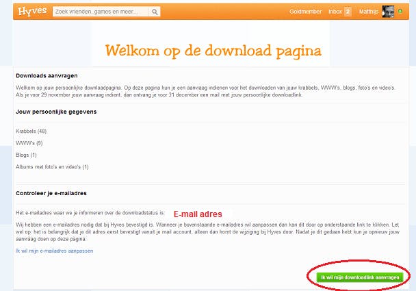 Ga naar Hyves.nl/bedankt en log in met je profielgegevens. Druk op "Vraag hier jouw downloadlink aan".
