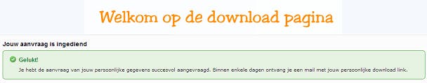 Controleer je e-mail adres goed: naar dit adres wordt de downloadlink toegestuurd. Als je adres klopt, druk op de knop reechtsonderaan: "Ik wil mijn downloadlink aanvragen". Als het goed gaat, krijg je boven in beeld op de downloadpagina de onderstaande melding te zien: