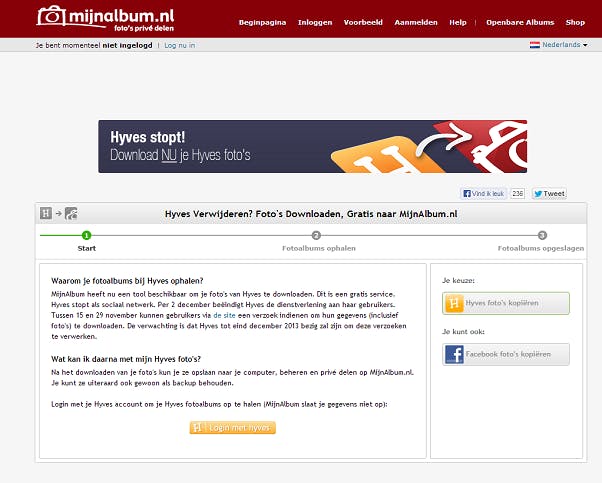 Mocht je nu heel veel foto's hebben op je Hyves profiel en ze willen bewaren of afdrukken, dan kan dat onder anderen bij een commerciële partij; MijnAlbum. Je moet dan wel een profiel aanmaken. Je krijgt er de mogelijkheid om direct je foto's te bestellen, te downloaden of te delen. Ook meldt het bedrijf nog even terloops, dat je heel gemakkelijk je Facebook foto's kunt downloaden via deze service....