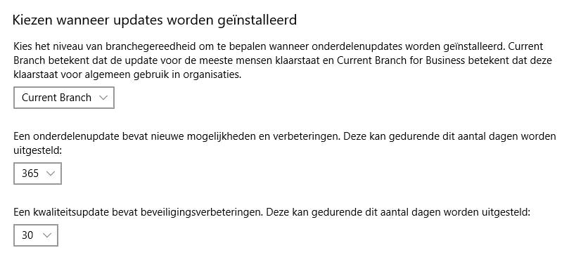 Vanaf de Creators Update kunnen onderdelenupdates voortaan voor langere periodes worden uitgesteld, met een maximum van 365 dagen. Voor kwaliteitsupdate geldt dat deze maximaal 30 dagen kunnen worden uitgesteld.