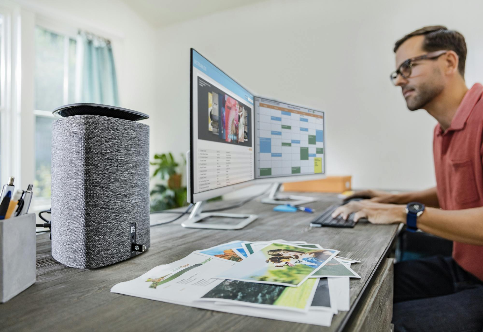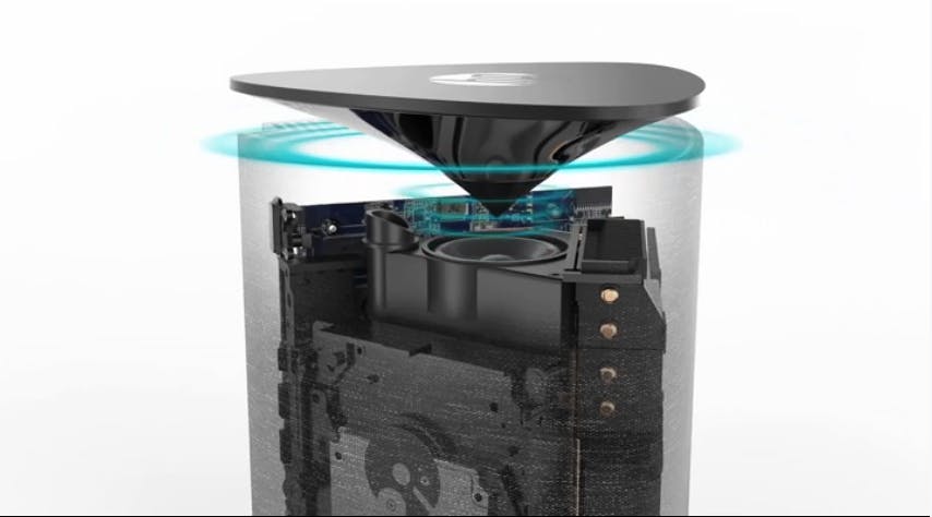 De Wave doet natuurlijk sterk denken aan een speaker en geluid is dan ook belangrijk. Voor een goede geluidskwaliteit werkt HP samen met Bang & Olufsen. Een parabolische reflector aan de bovenzijde van de behuizing zorgt ervoor dat het geluid van de speaker in het midden naar alle kanten reflecteert. Daarnaast fungeert deze opening ook als uitlaatklep voor de ventilatie. Dankzij twee ingebouwde microfoons kun je ook praten tegen de Wave waarbij Microsofts Cortana voor de spraakherkenning zorgt.
