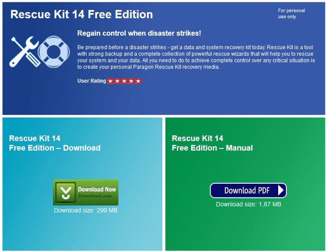 Onze redder is hier te vinden. Hier wacht een stevige download van maar liefst 299 MB. Open het bestand rk14_free.exe en laat de installer zijn ding doen. Het is de bedoeling dat je de herstelsoftware vanaf een extern opstartbaar medium laat werken, met het interne systeem van de pc hoef je geen rekening meer te houden. Dat externe medium moet opstartbaar zijn. Het kan gaan om een dvd, een externe harde schijf of een usb-stick. In dit artikel gebruiken we een klein usb-stickje van 2 GB, groot genoeg om de Paragon-software en een besturingssysteem te bevatten. Lees ook: 11 tips voor snelle en simpele back-ups.