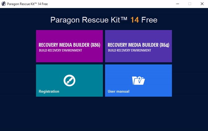Stop de usb-stick in de machine en open Paragon Rescue Kit 14 Free. Op die manier kom je meteen in de module om een herstelmedium te bouwen, namelijk de Recovery Media Builder. In het openingsscherm staan twee grote knoppen om een opstartbaar herstelmedium te maken: één voor een x86-systeem en één voor een x64-systeem (oftewel een 32- en een 64bit-systeem). Daarnaast is er nog een knop om de handleiding te openen en een knop om te registreren. De software is gratis, maar als je niet meteen registreert, moet je dat straks alsnog doen.