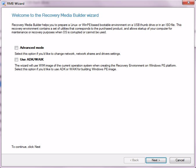 In het volgende scherm lijkt het alsof je slechts twee keuzemogelijkheden hebt en dat is niet helemaal waar. In Advanced mode kun je het netwerk wijzigen en in Use ADK/WAIK word je naar een Windows-download van meer dan 5 GB geleid. In de meeste gevallen heb je geen van beide opties nodig. Volg de kleine aanwijzing links onderaan: To continue, click Next. Dat doen we. Wie daarnet nog niet heeft geregistreerd, moet dat in het volgende scherm wél doen. Dat betekent dat je (gratis) een productsleutel en een serienummer moet aanvragen. Beide gegevens belanden onmiddellijk in je mailbox. We willen wil best aannemen dat Paragon geen spam zal sturen, maar voor dergelijke registraties gebruiken we toch veiligheidshalve een speciale wegwerp-mailbox.