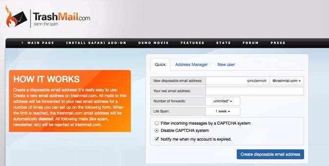 In allerlei situaties willen bedrijven, producten en diensten je e-mailadres weten. In de meeste gevallen belooft men om je gegevens niet vrij te geven, maar wij geloven al lang niet meer in sprookjes. Gegarandeerd word je daarna overspoeld door spamberichten. Om dat te vermijden, maak je snel een wegwerpmailadres bij bijvoorbeeld Trashmail of Mailinator. Bij Trashmail bepaal je zelf hoelang dit mailadres moet werken: één keer, twee keer of een aantal seconden, uren, dagen. De mails worden automatisch doorgestuurd naar je echt mailadres dat op deze manier buiten schot blijft. Ironisch genoeg moet je dan wel TrashMail.com vertrouwen met je persoonlijk mailadres. Bij Mailinator is elk adres voor de @mailinator.com openbaar, maar daar hoef je verder helemaal geen gegevens achter te laten.