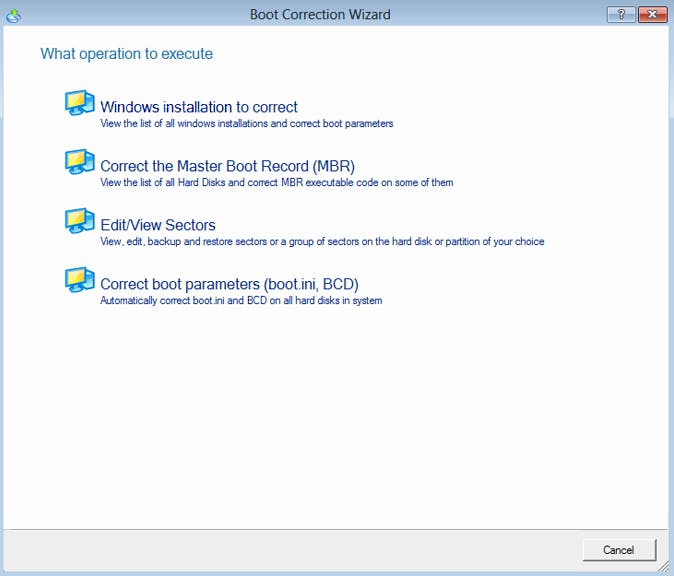 Met de knop Boot Corrector in het hoofdmenu van de Rescue Kit kun je de meeste opstartproblemen verhelpen. Als het niet gaat om een hardwareprobleem of om malwarebesmetting, dan is de kans groot dat deze tool de reddende engel is. De Boot Corrector Wizard zoekt uit of het probleem te maken heeft met een beschadigd systeem en corrigeert het probleem zolang het gaat over Windows 2000/XP/Vista/Server/7/8/8.1. We lezen in de supportpagina's nog niets over opstartreparaties in Windows 10. Deze module corrigeert ook het Master Boot Record (MBR). Dit is de informatie op de eerste sector van een harde schijf. Het MBR houdt bijvoorbeeld bij welk besturingssysteem er op de schijf staat en wat de computer bij de opstart in het geheugen moet laden. Is het MBR beschadigd, dan weet de pc niet eens meer dat hij op Windows draait. Deze tool repareert ook foute schijfletters in het register.