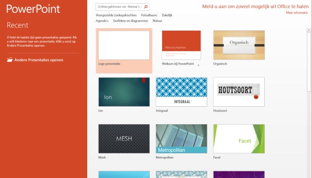 Zodra je PowerPoint start, kun je kiezen voor een van de meegeleverde sjablonen, maar het is veel leuker om je presentatie helemaal zelf vanaf de grond op te bouwen. Vanuit een leeg 'doek' maak je sneller een professioneel ogende presentatie. Sjablonen zien er fraai uit, maar je hebt er vaak meer werk aan om onnodige opsmuk eruit te halen en de lay-out naar wens aan te passen. Vandaar dat we op het beginscherm klikken op Lege presentatie en de sjablonen laten voor wat ze zijn.