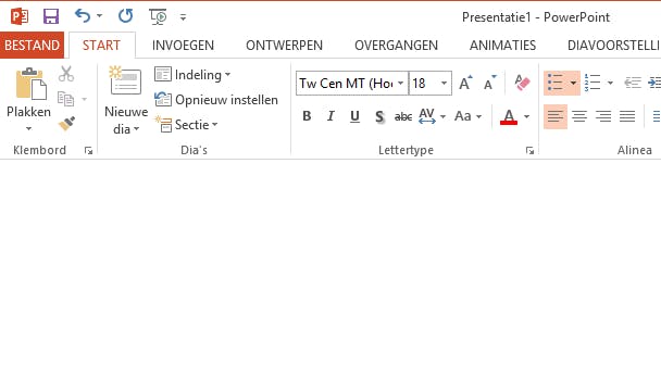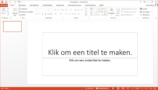 Als het gaat om uiterlijk en bediening lijkt PowerPoint sprekend op andere programma's uit de Microsoft Office-suite. Ben je bekend met bijvoorbeeld Word of Excel, dan voel je je vast snel thuis in dit presentatieprogramma. Ben je er minder bekend mee, dan is het belangrijk om te weten dat de traditionele menubalk is vervangen door tabbladen. Zodra je op een tab klikt, krijg je een lint te zien met daarin allerlei opties. Die zijn netjes gegroepeerd in een soort vakken, met onderin elk vak in lichtgrijs de naam van het bewuste onderdeel.
