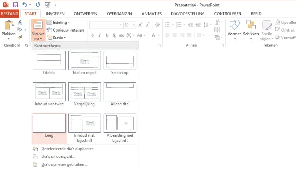 De titel en ondertitel op de titeldia zijn tekstvakken. PowerPoint kent allerlei soorten vakken. In een vak kan behalve tekst ook een plaatje of een filmpje staan. Elk vak kun je vrij over de dia verplaatsen en de grootte is aanpasbaar. Dankzij tekstvakken is de lay-out eenvoudig aan te passen. Je maakt een pagina (dia) dus net even wat anders op dan in een programma als Word. Om een nieuwe dia te maken, klik je op het lint Start in het vak Dia's op Nieuwe Dia. Voor het gemak noteren we dit voortaan als Start / Dia's / Nieuwe dia. Je ziet een lijstje met soorten dia's. Kies Leeg om met een blanco dia te beginnen. Aan de linkerzijde van het scherm bevindt zich een navigatiekolom waarin je miniaturen van alle dia's in je presentatie ziet. Zo kun je snel naar een willekeurige dia springen.