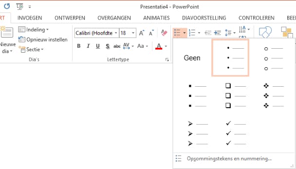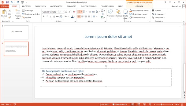 Wil je een opsomming maken, dan kan dat via Start / Alinea / Opsommingstekens of Start / Alinea / Nummering. Voor presentaties geldt dat je dia's het beste rustig kunt houden. Geen lappen tekst dus, maar bijvoorbeeld een paar steekwoorden of krachtige zinnen. Het is geen collectieve leesoefening, het moet jouw verhaal goed ondersteunen.