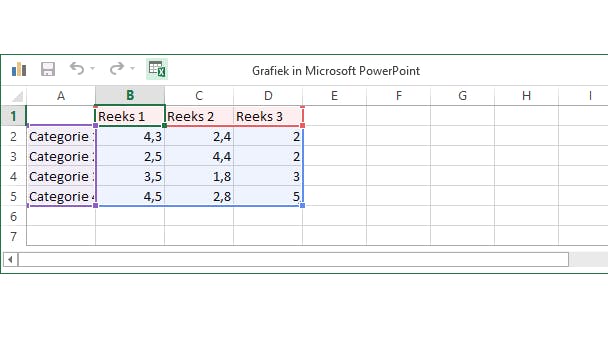 Wil je de grafiek liever via Excel vullen met gegevens? Klik dan bovenin de mini-spreadsheet van PowerPoint op het pictogram Gegevens bewerken in Microsoft Excel. Kom je later op deze dia terug en wil je de gegevens opnieuw bewerken via Excel of de mini-spreadsheet? Klik dan met rechts op de grafiek en ga naar Gegevens bewerken. Zodra je aan een grafiek werkt, staan er twee extra linten Ontwerpen en Indeling tot je beschikking onder de groene kopregel Hulpmiddelen voor grafieken. Daarmee kun je de stijl en de inhoud van de grafiek nog verder aanpassen.