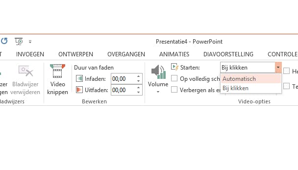 Op een bedrijfsnetwerk streamen is bijvoorbeeld niet altijd toegestaan. Lokale films gebruiken is altijd het veiligst. Ze worden in het presentatiebestand bewaard. Zodra je een film hebt toegevoegd, krijg je onder de blauwe kopregel Hulpmiddelen voor video twee nieuwe linten te zien. Via het lint Opmaak kun je net als bij afbeeldingen (zie tip 07) het materiaal bewerken of er een afbeeldingsstijl op toepassen. Gebruik het lint Afspelen als je het filmpje wilt bijsnijden, in of uit wilt faden of om het volume aan te passen. Via de optie Starten bepaal je of het filmpje meteen begint te draaien of pas na een muisklik.