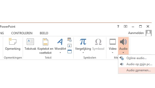 Ook muziek, geluiden of een commentaarstem kun je prima in een presentatie gebruiken. Je voegt het toe via Invoegen / Media / Audio. Je krijgt opnieuw extra linten te zien, ditmaal onder een blauwe kopregel Hulpmiddelen voor audio. Op het lint Afspelen kun je onder andere het geluid automatisch laten starten, in- en uitfaden en een fragment uitknippen. Behalve lokale geluidsbestanden inladen, kun je ook geluid opnemen met de ingebouwde microfoon van je computer, of gebruikmaken van online materiaal dat vrij van rechten is. Dit laatste is wel omslachtig, omdat je geen kant-en-klare lijst ziet, maar via trefwoorden alles zelf maar moet zien te vinden. Het beste kun je daarom gewone lokale geluidsbestanden gebruiken. Audio kun je overigens ook prima gebruiken om een presentatie te maken waarbij jij niet aanwezig hoeft te zijn. Je kunt het verhaal bijvoorbeeld inspreken, zodat een commentaarstem het verhaal vertelt. Dat is onder andere handig als je de presentatie online zet.