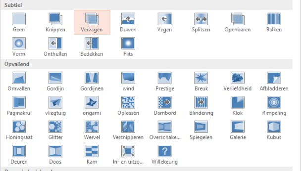 Om van je presentatie een vloeiend geheel te maken, kun je op het lint Overgangen instellen hoe dia's in elkaar overgaan. Er is volop keus, want achter het rijtje overgangen kun je via pijltjesknoppen extra rijen opvragen of een totaaloverzicht krijgen. Voor een professioneel ogend effect is een subtiele overgang de beste keuze. Wat een overgang niet moet doen, is de aandacht van je verhaal afleiden. Een drukke overgang, of na elke dia weer voor een ander effect kiezen, is af te raden.