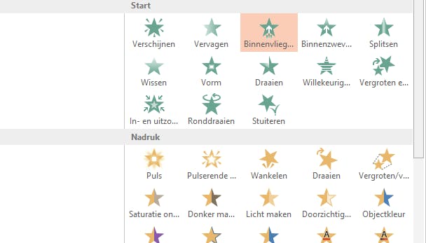 Het lint Animaties stelt je in staat om een animatie aan elementen van een dia toe te voegen. Je klikt eerst op een element van een dia om het te selecteren, bijvoorbeeld een tekstvak of een afbeelding. Daarna kun je er een animatie aan toevoegen. Zo kun je de tekst of de afbeelding langzaam laten opkomen, het beeld binnen of weg laten vliegen of laten wankelen. Zelfs de bewegingsrichting en manier van bewegen is instelbaar. Een subtiel effect kan nog wel iets aan je presentatie toevoegen, maar maak er geen poppenkast van.