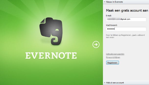 Surf naar www.evernote.com en klik bovenaan op de knop Downloaden. Na het downloaden voer je het installatieproces uit. Neem alle stappen van de installatiewizard door en start het programma. Nadat je een e-mailadres en wachtwoord hebt ingevuld, klik je op Registreren.