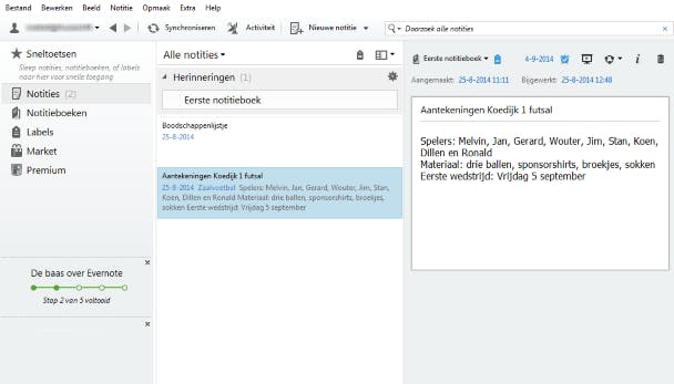 Zodra je Evernote voor de eerste keer opstart, klik je op Beginnen / Een notitie maken. In het menu kies je tweemaal achtereenvolgens voor Nieuwe notitie. Geef de notitie een logische naam, bijvoorbeeld 'Suggesties Sinterklaascadeaus' of 'Aantekeningen sportclub'. Typ vervolgens de gewenste aantekeningen. Gebruik de knoppenbalk om de tekst op te maken. Dit werkt op dezelfde wijze zoals je van een tekstverwerker gewend bent.