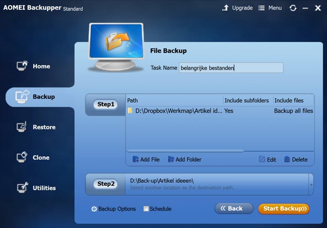 AOMEI Backupper voor Windows is een zeer veelzijdig programma en biedt alles wat je nodig hebt om een goede back-up te maken. Download en installeer de gratis versie van het programma. Alles wat met het veiligstellen van bestanden te maken heeft staat je achter de knop Backup. Herstel van gegevens gaat via de knop Restore. Lees ook: Veilig en snel een dubbele back-up maken.