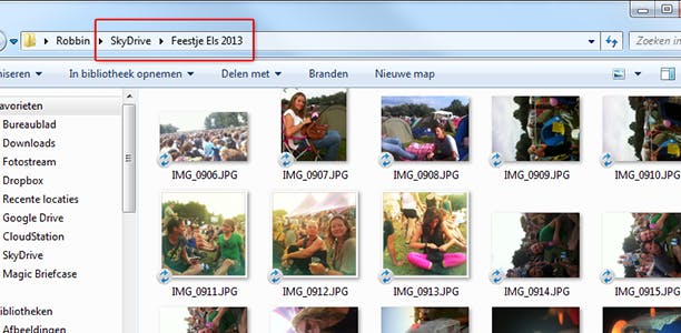 Na de installatie verschijnt een icoontje van een wolk in je systeemvak. Dubbelklik hierop om je SkyDrive-mappen te openen. Maak met de Windows Verkenner een nieuwe map aan, bijvoorbeeld Feestje Els 2013. Kopieer alle foto’s die je wilt delen met je vrienden naar deze map. Surf naar https://skydrive.live.com en meld je aan met je Microsoft-account. Alle mappen van je SkyDrive worden getoond.