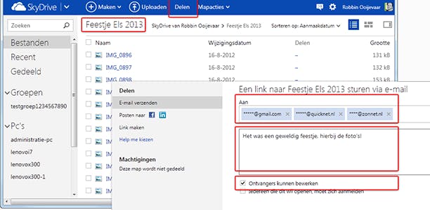 Open de map die je zojuist hebt gemaakt (bij ons Feestje Els 2013). Je ziet alle afbeeldingen die je zojuist op je computer in deze map hebt geplaatst. Klik op Delen en typ de namen van de personen die de map mogen zien. Gebruik een komma om meerdere mailadressen op te geven. Onder in beeld kan je een persoonlijk berichtje kwijt aan de geadresseerden.